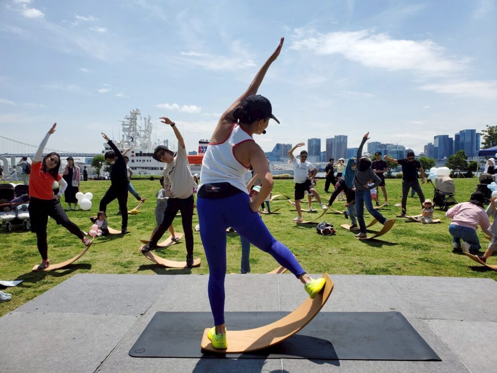 ドイツ発の木製バランスボード「ダスブレット」を使った体幹トレーニング体験。